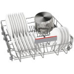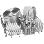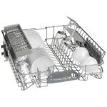 ماشین ظرفشویی بوش مدل 45DW10Q با دو سبد طراحی شده که سبد بالایی توانایی قابلیت تنظیم ارتفاع را داشته تا بتوانید ظروفی بزرگ را جای دهید و فاصله بین سبدهاه بیشتر شود. ریلی بودن سبدها هم راحتی جابهجایی آنها را امکان پذیر کرده و میتوانید بدون زحمت و اذیت هر بار سبدها را بیرون آورده و داخل برد. بر روی درب ماشین ظرفشویی بوش مدل 45DW10Q هم نمایشگر نشان زمان باقی مانده شستشو را نشان داده و دکمههایی برای انتخاب برنامه و تابع شستشو که در کنار همین نمایشگر واقع شدهاند. سبد پایینی را اگر نگاه بیاندازید متوجه خواهید شد که یک سبد کوچک مخصوص کارد و چنگال هم طراحی شده تا بتوانید این ظروف کوچک را به خوبی جایی دهید.
